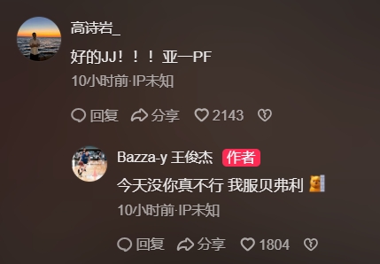 08月17日讯 昨晚的男篮亚洲杯半决赛,中国男篮98比84战胜新西兰,挺进决赛。赛后,王俊杰更新社媒:“艰磨苦难,玉汝其成。”高诗岩现身评论区:“好的JJ!!!亚一PF”王俊杰则是回复说:“今天没你真不行 我服贝弗利”